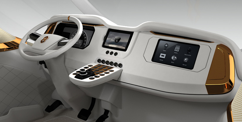 Das hohe Sicherheitsrating des Fahrerhauses wird verstärkt durch eine solide, aber dennoch ultra leichte Bauweise in Kohlefaser. Die Panoramafenster und ein Kamerasystem mit Vogelperspektive sichern eine exzellente Übersicht beim Rangieren. Weitere Sicherheits-Features sind auf Wunsch erhältlich.