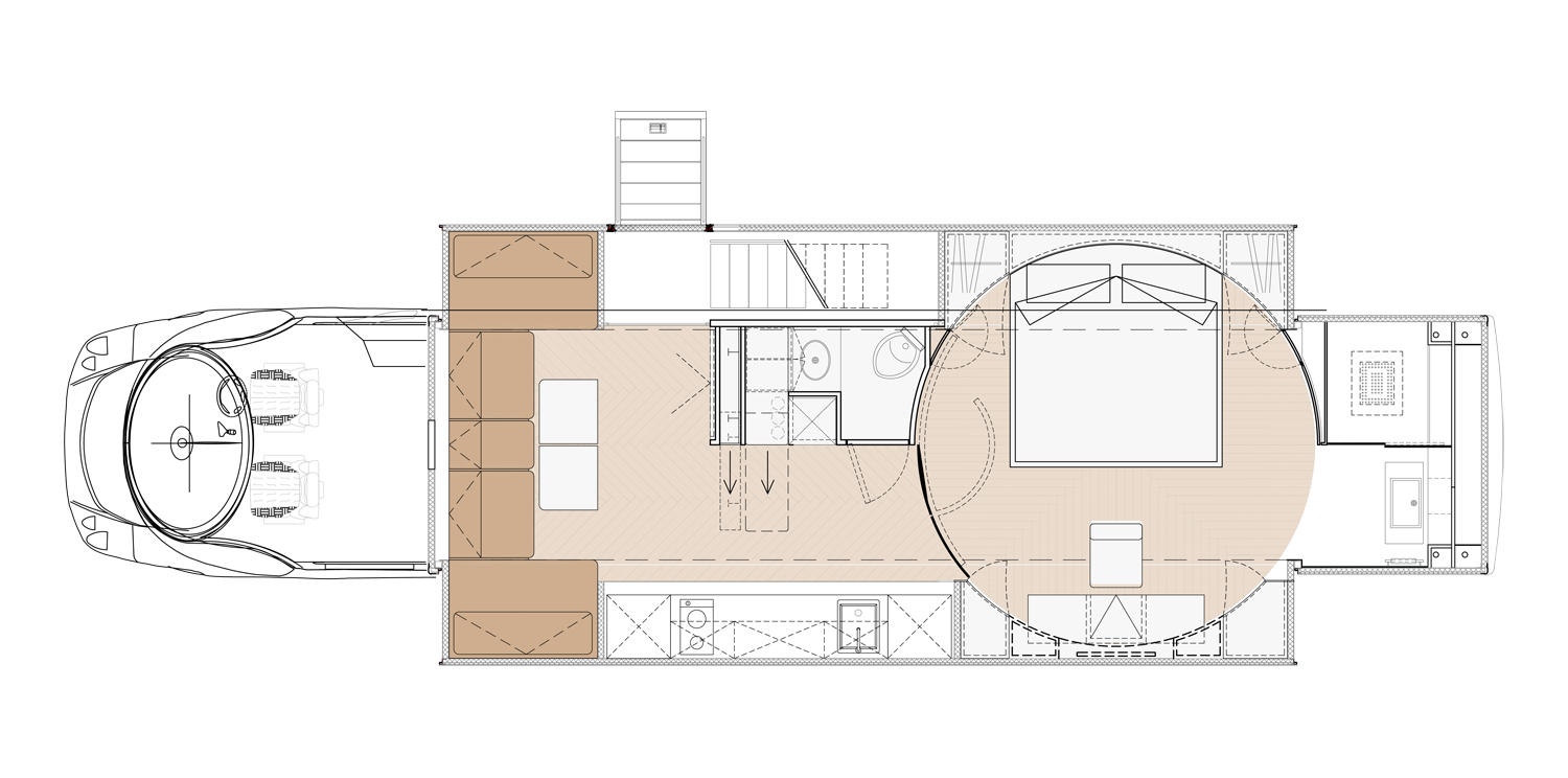 Eine externe Zugangstreppe führt zu dem Oberdeck mit integriertem Loungemobiliar und Fußbodenheizung. Die Innenraumgestaltung genügt höchsten Ansprüchen, perfekt für Ihr mobiles Zuhause.