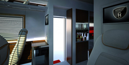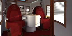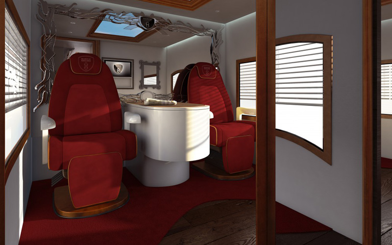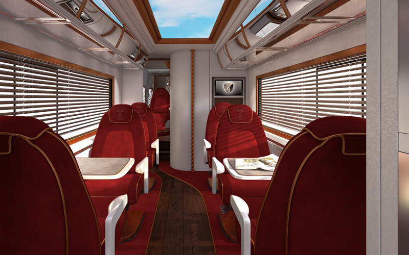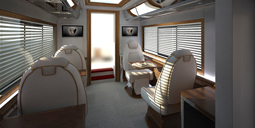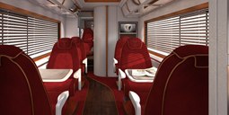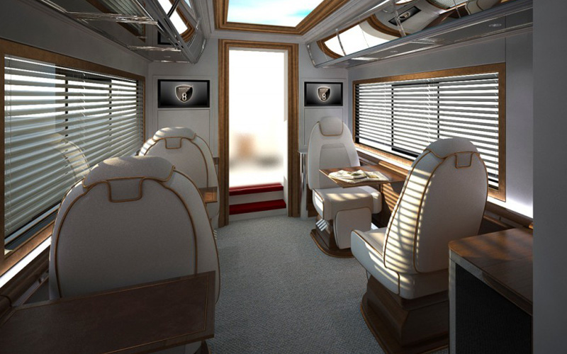 Unsere einzigartigen Jets auf Rädern sind eine völlig neuartige Herangehensweise an luxuriösen Personentransport, speziell auf der Mittel- und Kurzstrecke. Die Business Lounge Sitze bieten Erholung zwischen Luxusshopping, Gala Event oder einfach auf dem Weg zum nächsten Geschäftstermin. Die sechs komfortablen, rotierenden Sitze sind ausgestattet mit Massagefunktion und Klimatisierung. Aufsehenerregende Mobilität mit einer Innenraumhöhe von 2,5 Metern bietet den Passagieren einen Ort zum Entspannen in angenehmer Atmosphäre.