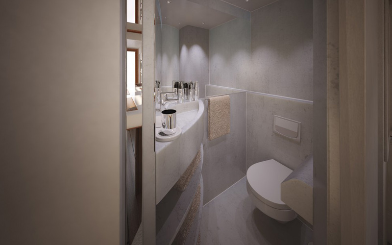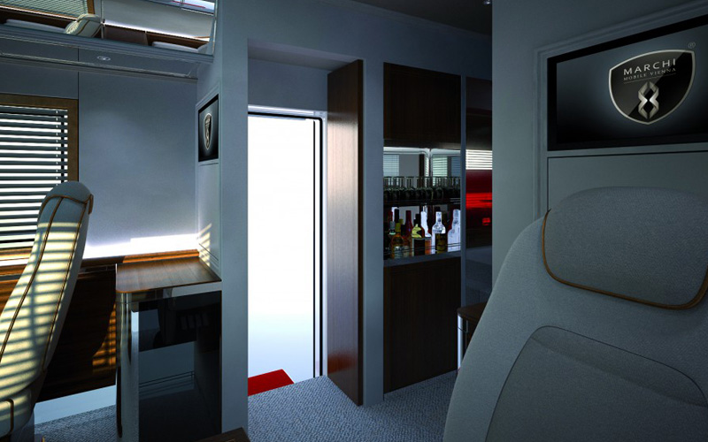 Während der Fahrt können Sie sich über die aktuelle Route informieren oder auch das integrierte Infotainment System nutzen. Das separate Badezimmer bietet Gästen und Eigner die Möglichkeit, sich frisch zu machen. Die bordeigene Bar lockt mit kühlen Getränken auf dem Weg zum nächsten Halt.